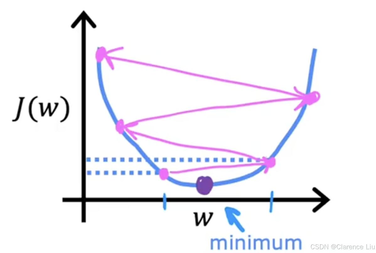 - 学习率 α \alpha α的选择,对梯度下降实现的效率影响巨大,如果 α \alpha α选择不当,梯度下降可能无法工作。如果 α \alpha α过小,可能需要很多步才能达到极值;如果 α \alpha α过大,可能一步就跳过极值点了,甚至可能无法达到极值点,像下面这个例子