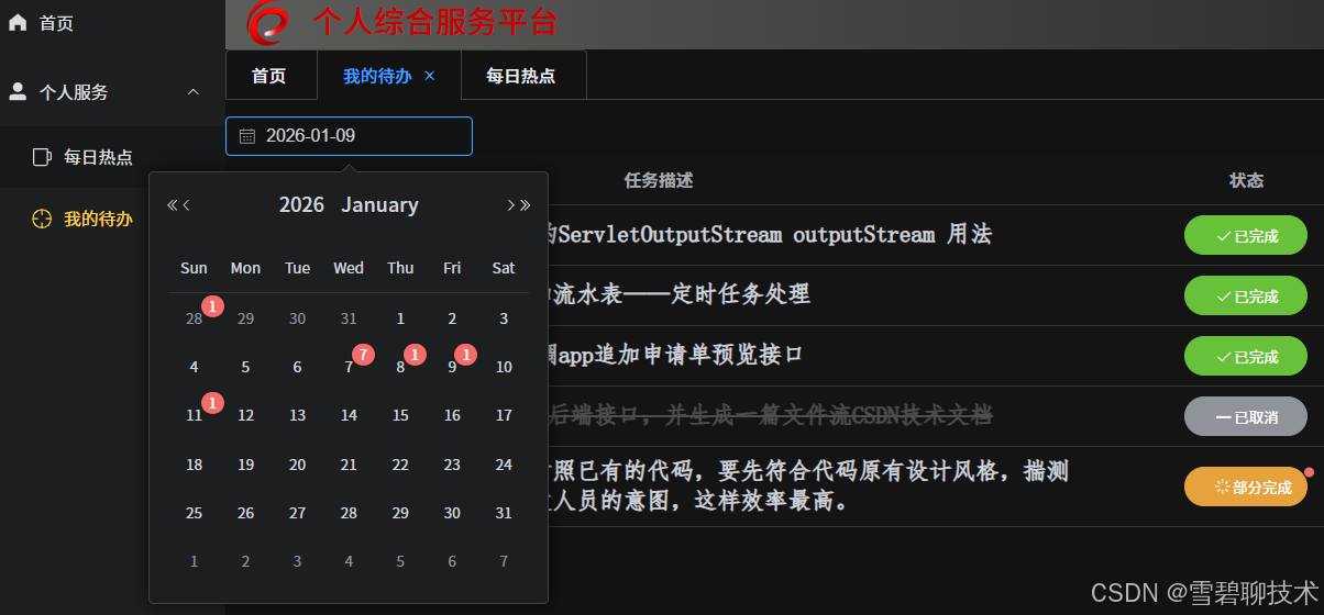 ②@change事件,在日期被切换时触发(比如从2026-01-01切到了2026-01-02号),由于日期切换时,可能直接跨月份,所以需要查询最新月份的每日未完成待办数量;