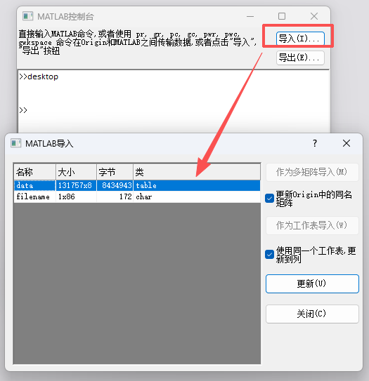 发现此处matlab解析成table无法以工作表导入,故而先直接手动复制,或则txt导入origin