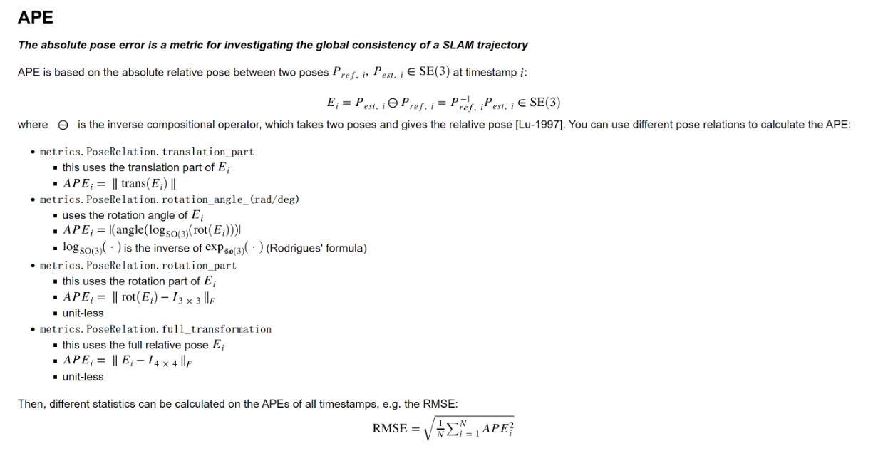 APE绝对位姿误差(Absolute Pose Error,APE);同一时刻下计算,EVO可选平移\旋转\以及都考虑