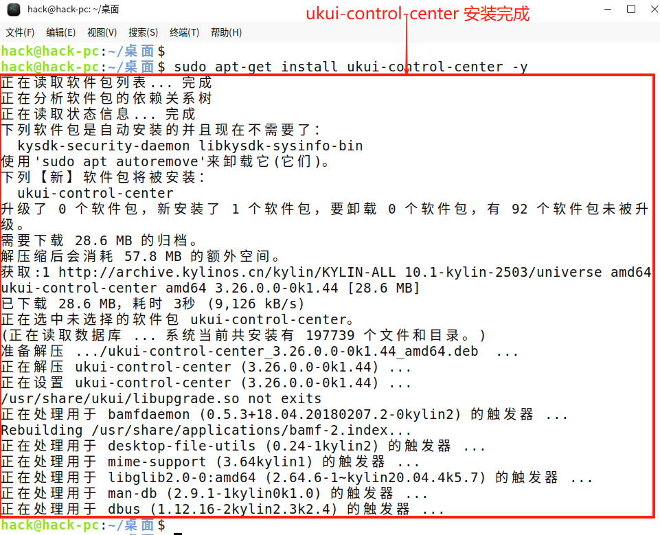 2.输入【sudo apt-get install ukui-control-center -y】,按enter键;