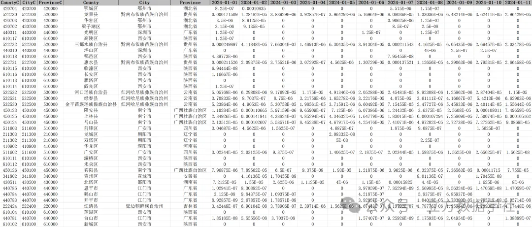 基于原始的逐日、逐月和逐年降水率栅格数据(可查看之前的文章获悉详情),我们采用国家地理信息公共服务平台(天地图)发布的审图号为GS(2024)0650号的2024年省市县三级行政区划Shp数据(可查看之前的文章获悉详情),对每个省\每个地级市\每个区县内的栅格值进行了求平均数处理,得到了省市县三级的逐日、逐月和逐年的降水率数据!