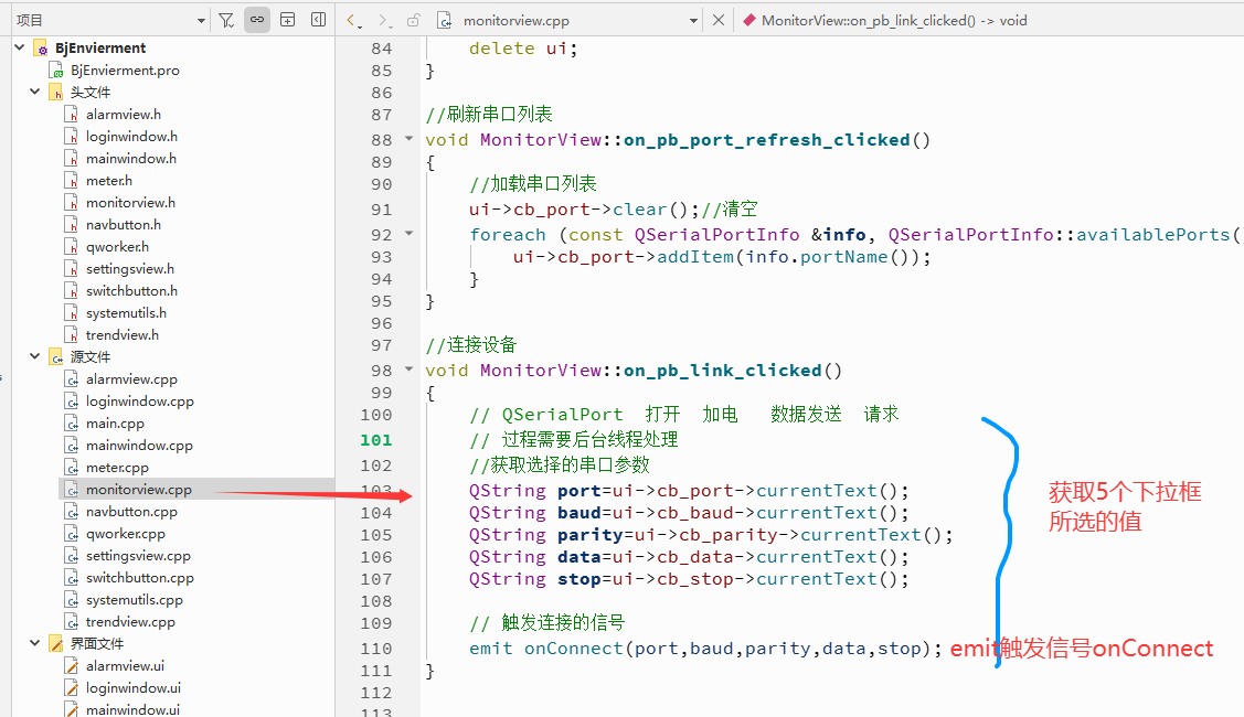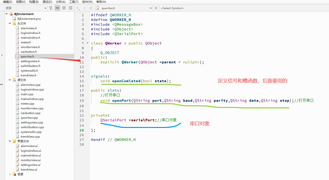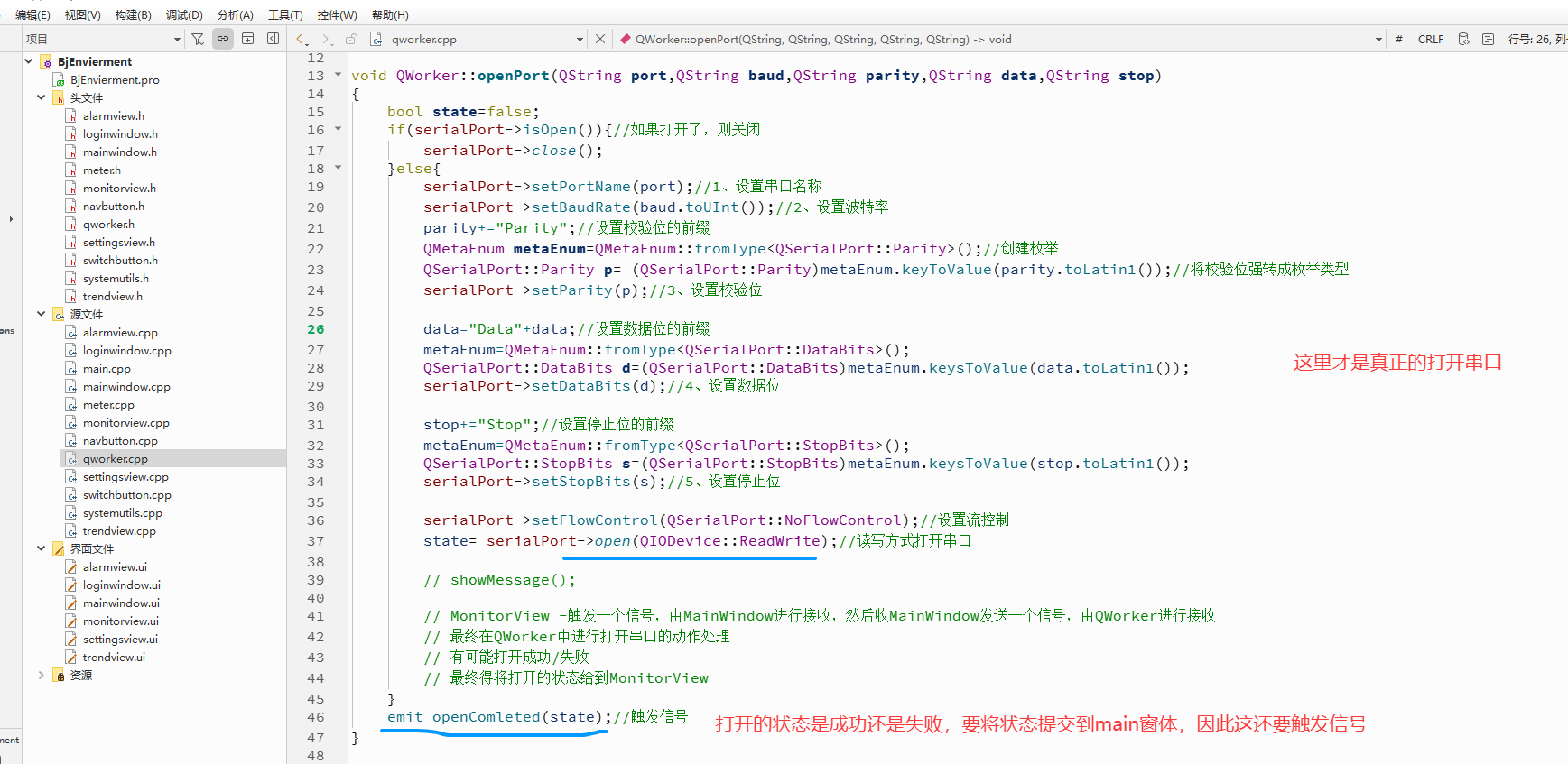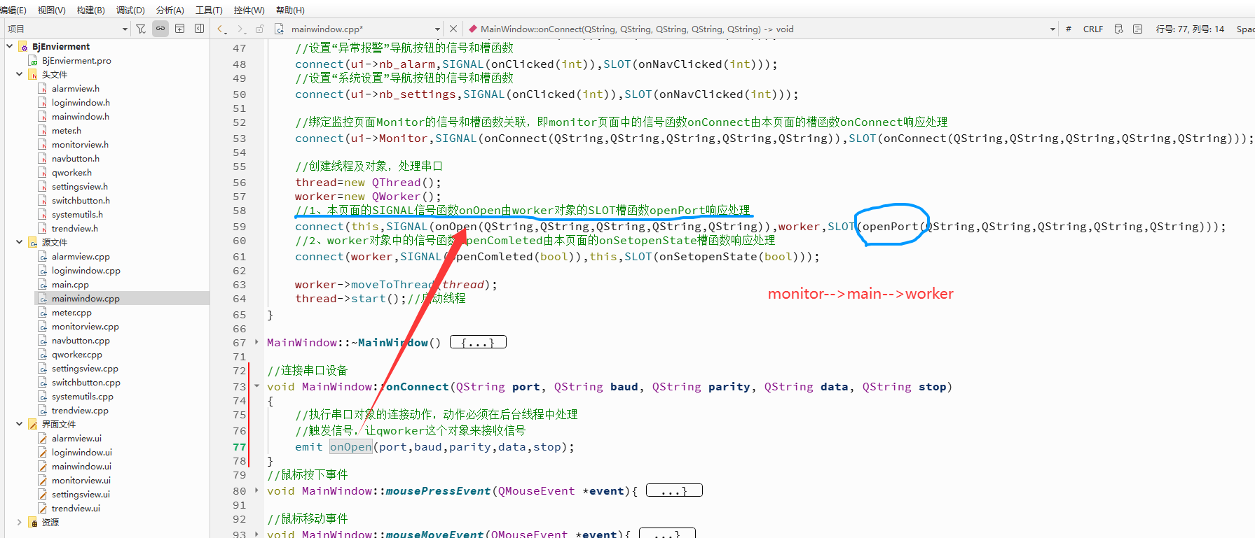 //1、本页面的SIGNAL信号函数onOpen由worker对象的SLOT槽函数openPort响应处理