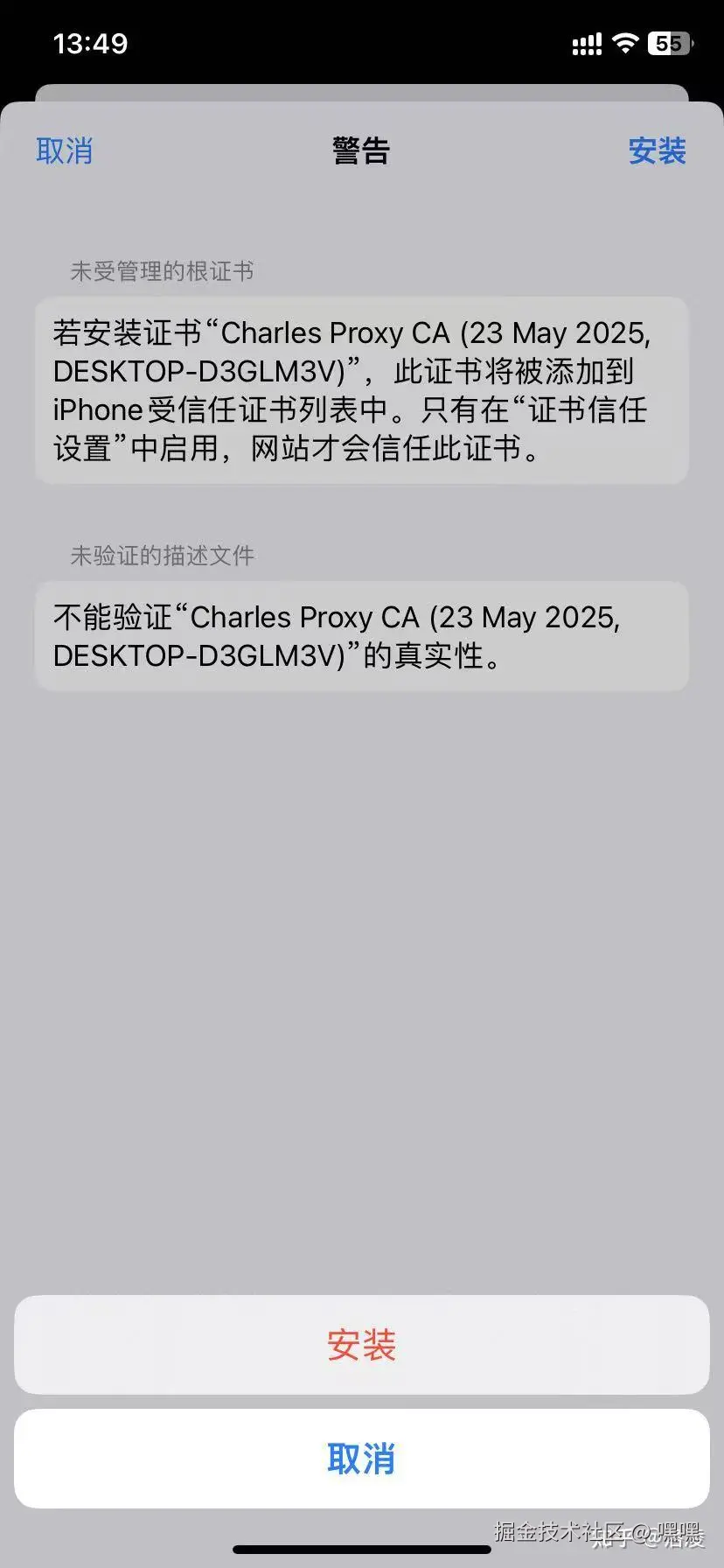 首先安装charles,这个就不说了。 然后是在电脑上安装charles根证书,这里以windows为例,照着一 - 2 的步骤安装即可。这里一般没有问题。 下一步就是在手机上安装charles根证书,这里以iOS为例,貌似安卓现在权限收的很紧,只能root。安装的时候让访问chls.pro/ssl .但是貌似这个网址打不开。可以访问第四步查看解决哈。