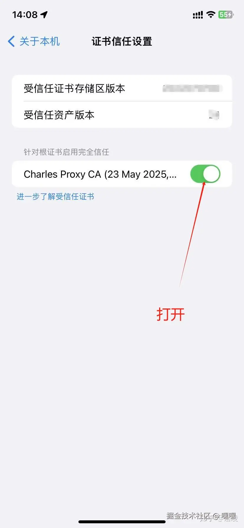 然后在设置 -> 通用 -> 关于本机 -> 证书信任设置 开启证书信任即可