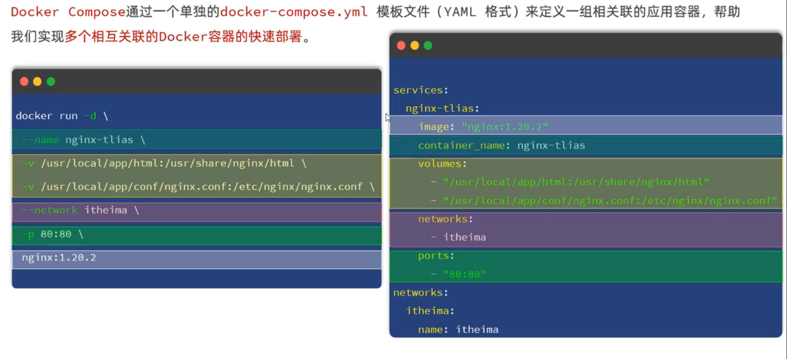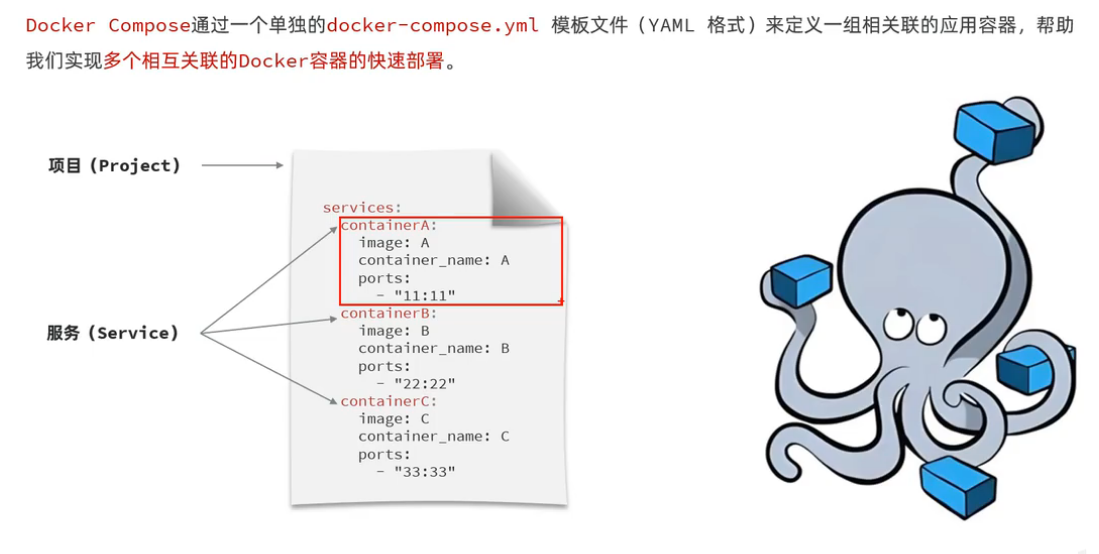 而Docker Compose就可以帮助我们实现多个相互关联的Docker容器的快速部署。它允许用户通过一个单独的 docker-compose.yml 模板文件(YAML 格式)来定义一组相关联的应用容器。