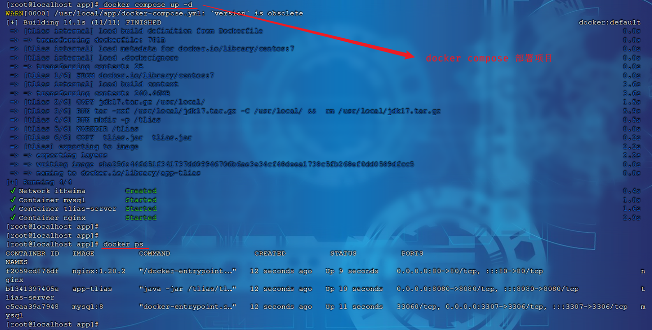 编写好docker-compose.yml文件,就可以部署项目了。语法如下: