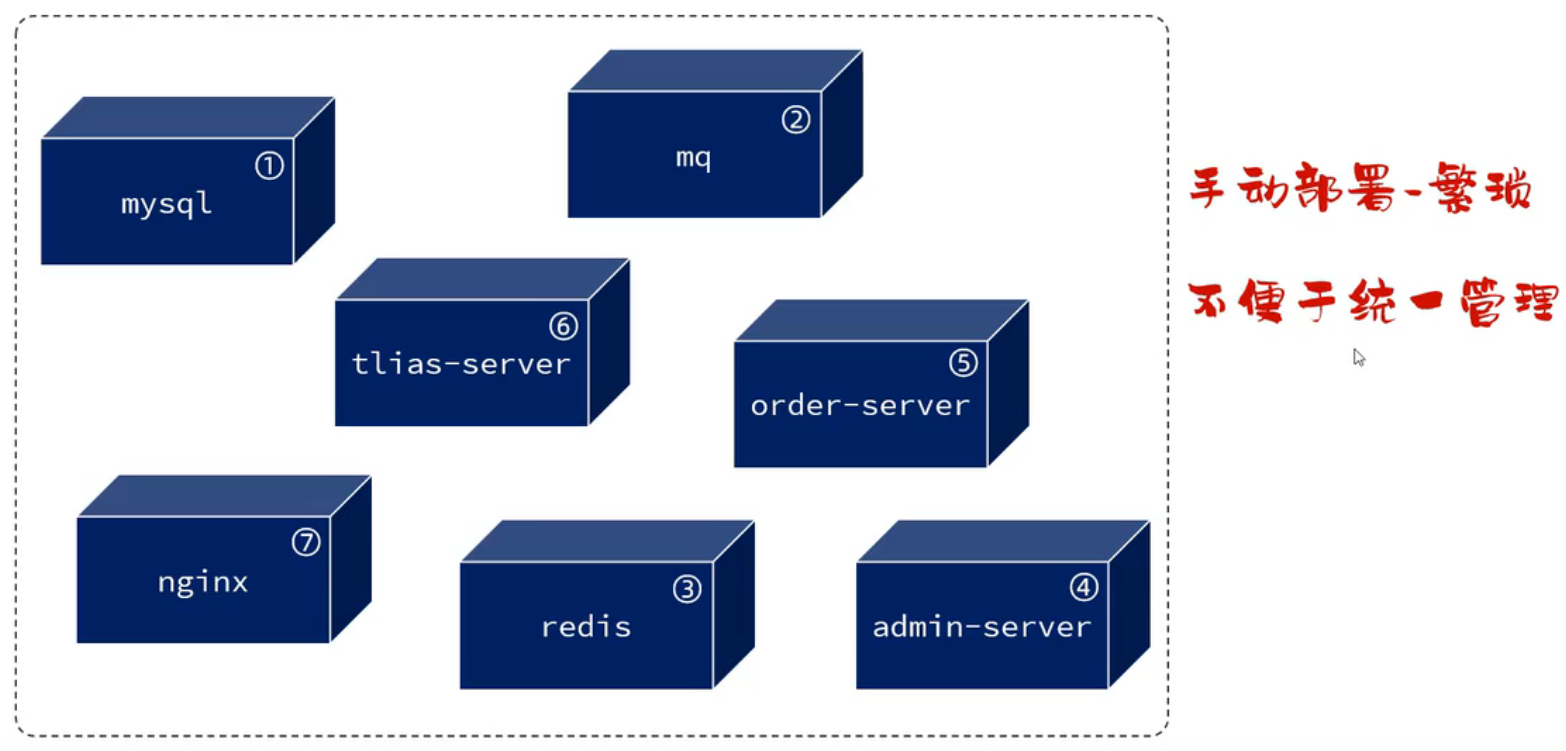 而稍微复杂的项目,其中还会有各种各样的其它中间件,需要部署的东西远不止3个。如果还像之前那样手动的逐一部署,就太麻烦了。