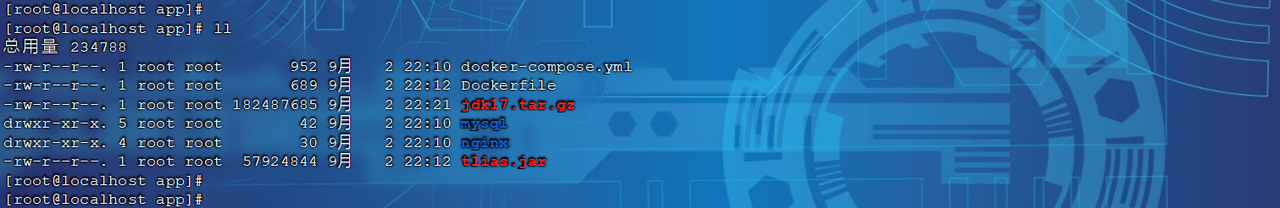 2). 上传资料中提供的 "资料/05. Docker Compose" 中的文件及文件夹到 /usr/local/app 目录中,如下所示: