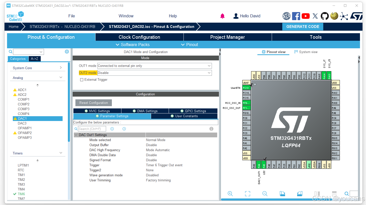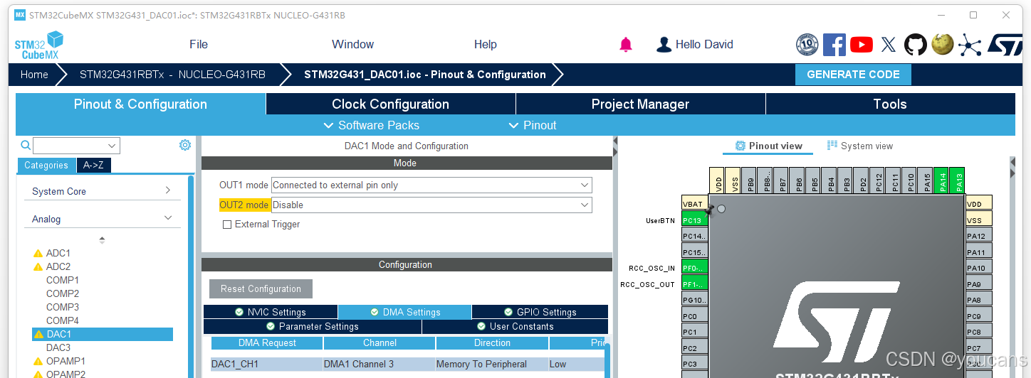 (1)完成 DAC 配置后,Pinout view 视图中的 PA4 引脚就自动配置为 "DAC1_OUT1"。如未自动完成,可以手动设置。
