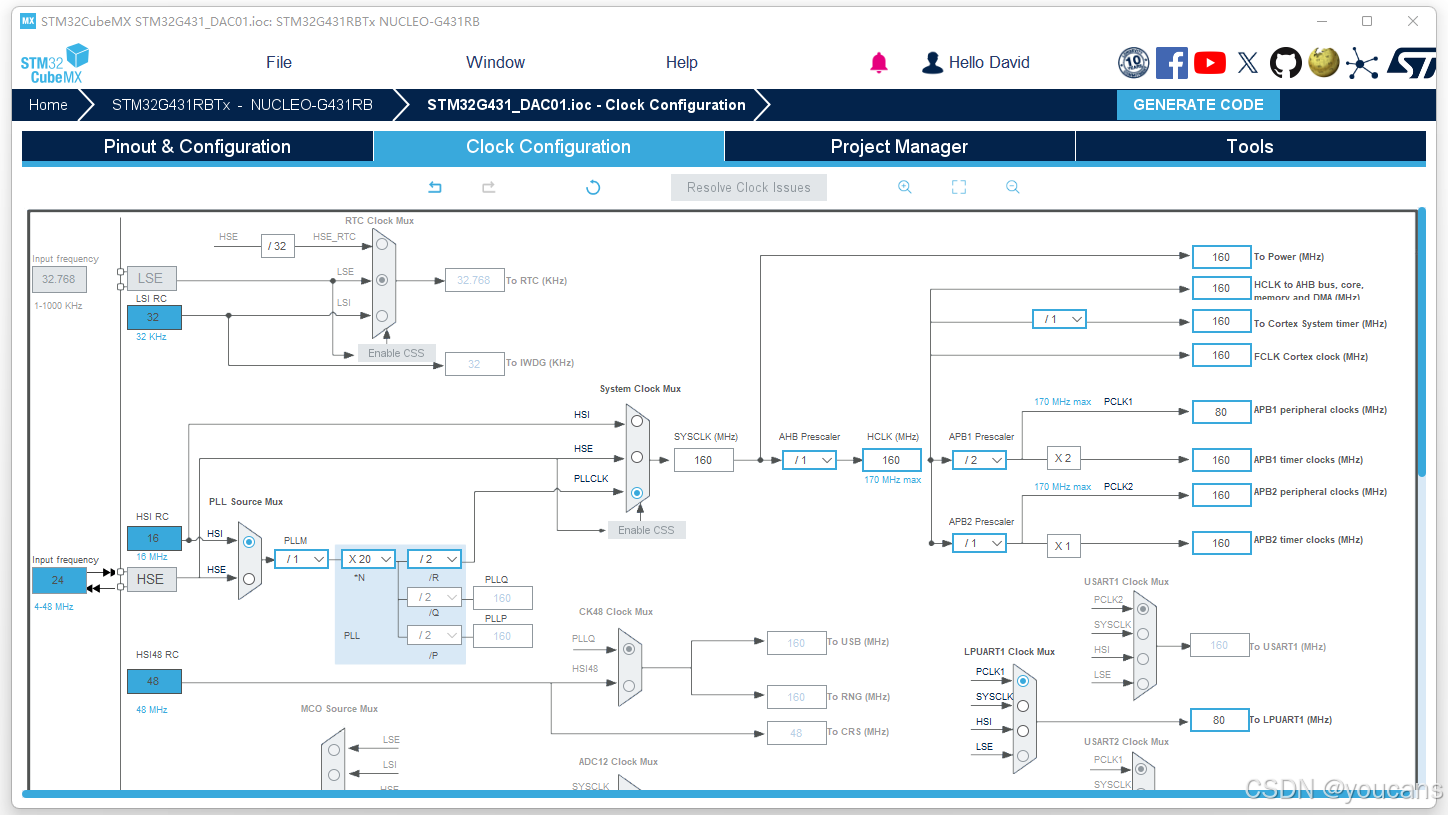 - 时钟与工程配置:在 Clock Configuration 视图进行时钟配置,如下图所示。