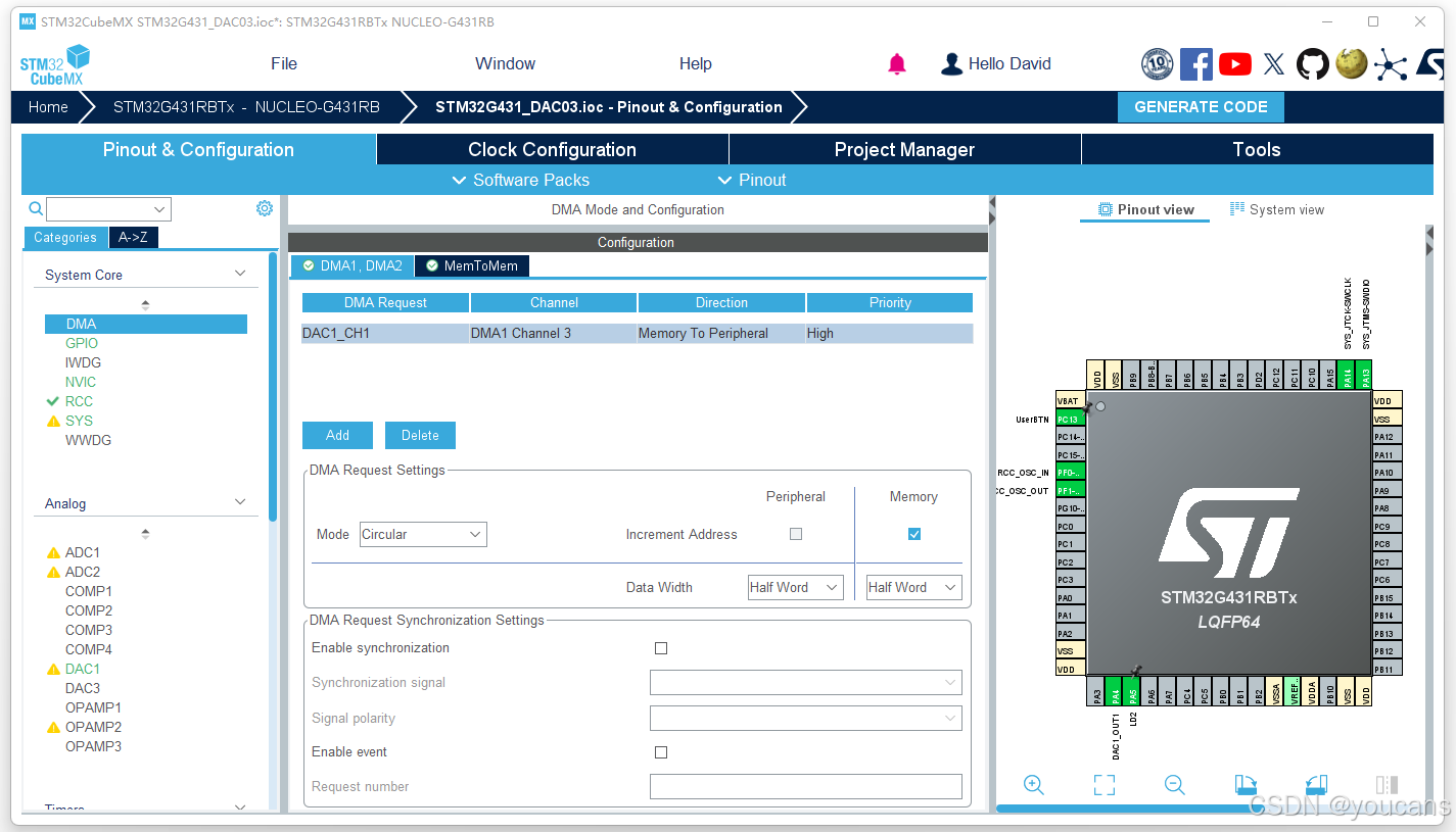 (2)DMA 配置。虽然本实验可以使用 查询(Polling)方式读写 DAC,但考虑到后续连续采样或实时波形输出,可以为 DAC 配置 DMA。