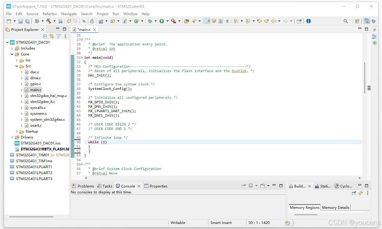 代码生成后,已经自动进入 STM32CubeIDE,并打开创建的 STM32G431_DAC01 项目。在 "Core\Src" 目录中,已经生成了 dac.c 和 main.c 等基础程序。