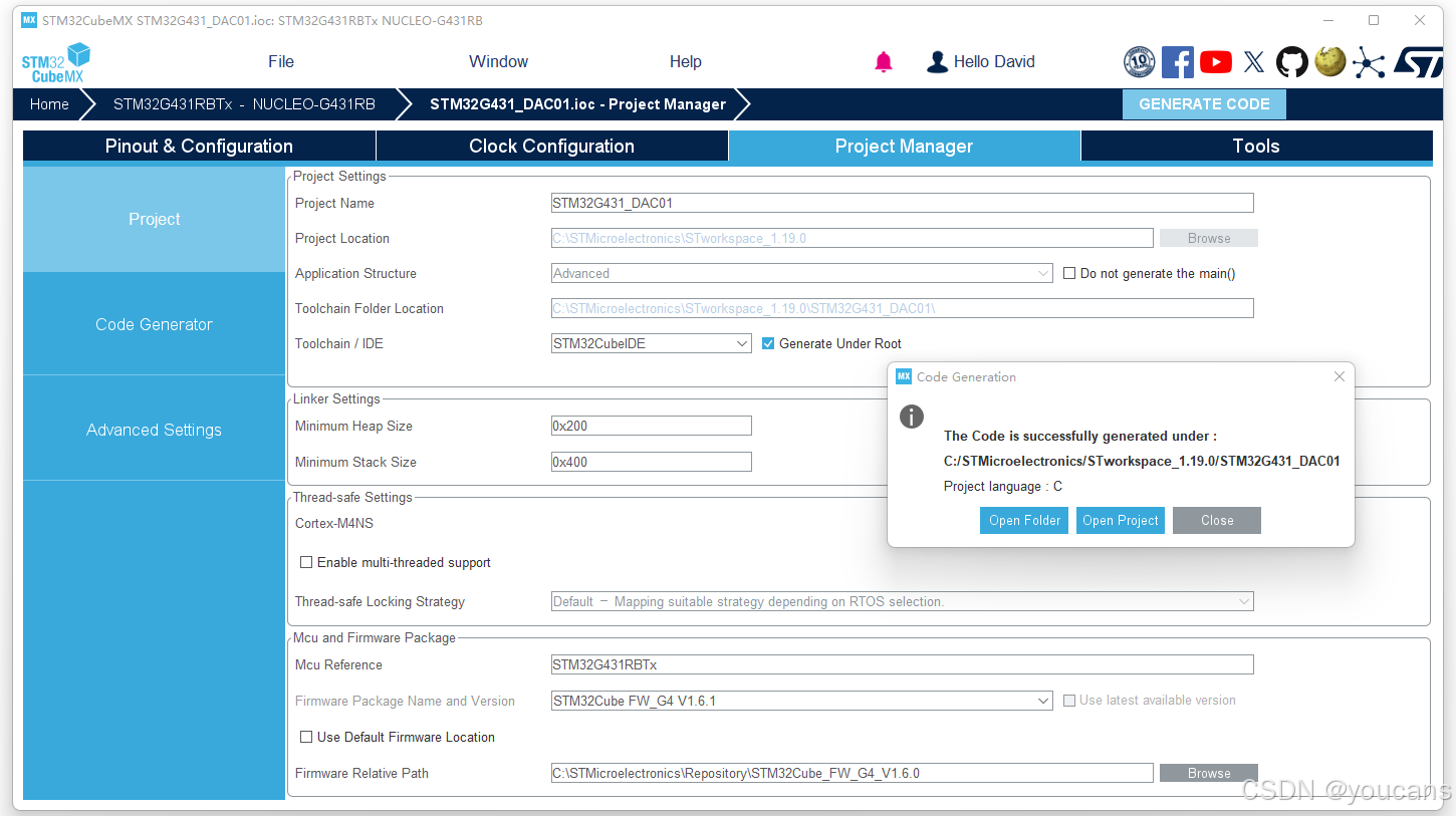 点击右上角 "GENERATE CODE" ,将自动生成带 .ioc 的工程文件 "STM32G431_DAC01.ioc"