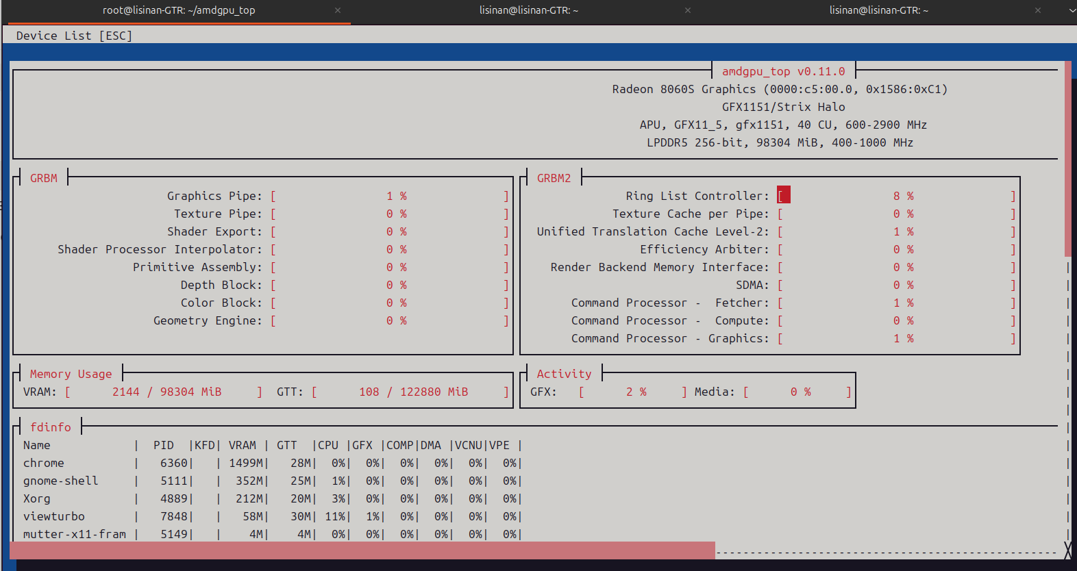 同事购置一台零刻AI Max395,已装Ubuntu 24.04,拿来玩耍,打算部署GLM-4.7,需要设置显存突破96GB限制(因Max 395 BIOS中可分配的最大显存为96G,为能够运行101G的模型权重,需通过Linux GTT来设置显存突破96G的限制)。rocm-smi回显信息有限,安装amdgpu_top监控工具。