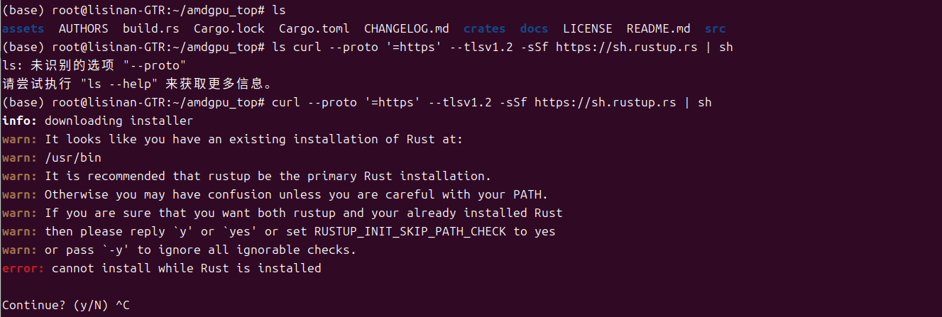 终端提示你系统/usr/bin目录下已经预装了 Rust,而rustup是 Rust 的官方版本管理工具,默认希望成为系统的「唯一 Rust 环境」,因此触发了路径检查警告,最终报错cannot install while Rust is installed。