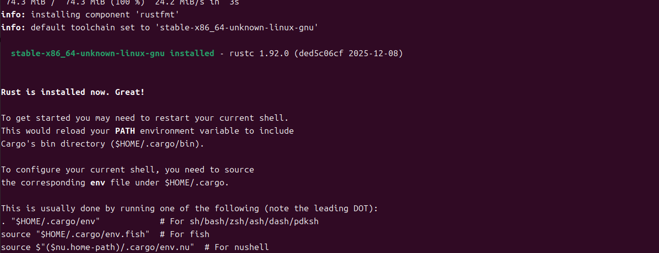 安装完成后,需要加载环境变量,让系统识别rustup和cargo(Rust 的包管理工具):