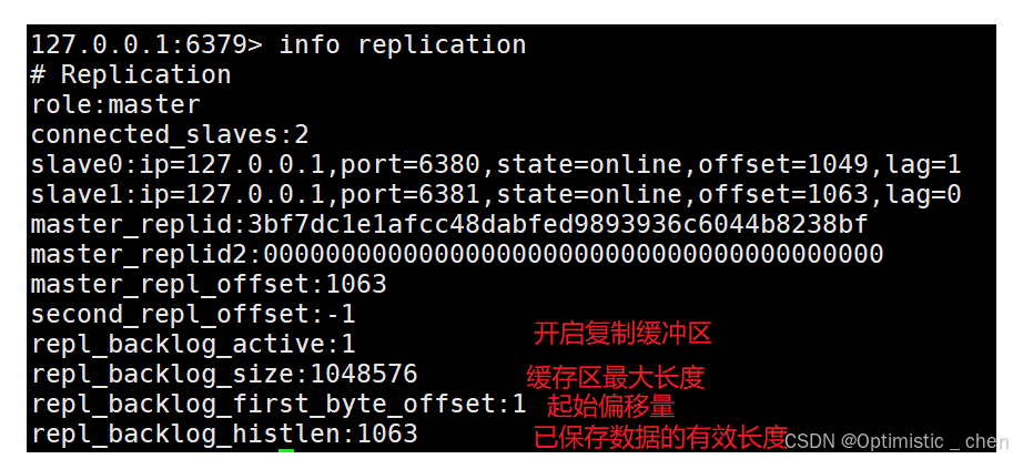 由于缓冲区本质上是先进先出的定⻓队列,所以能实现保存最近已复制数据的功能,⽤于部分复制和复制命令丢失的数据补救 。相关信息可以通过主节点info replication中: