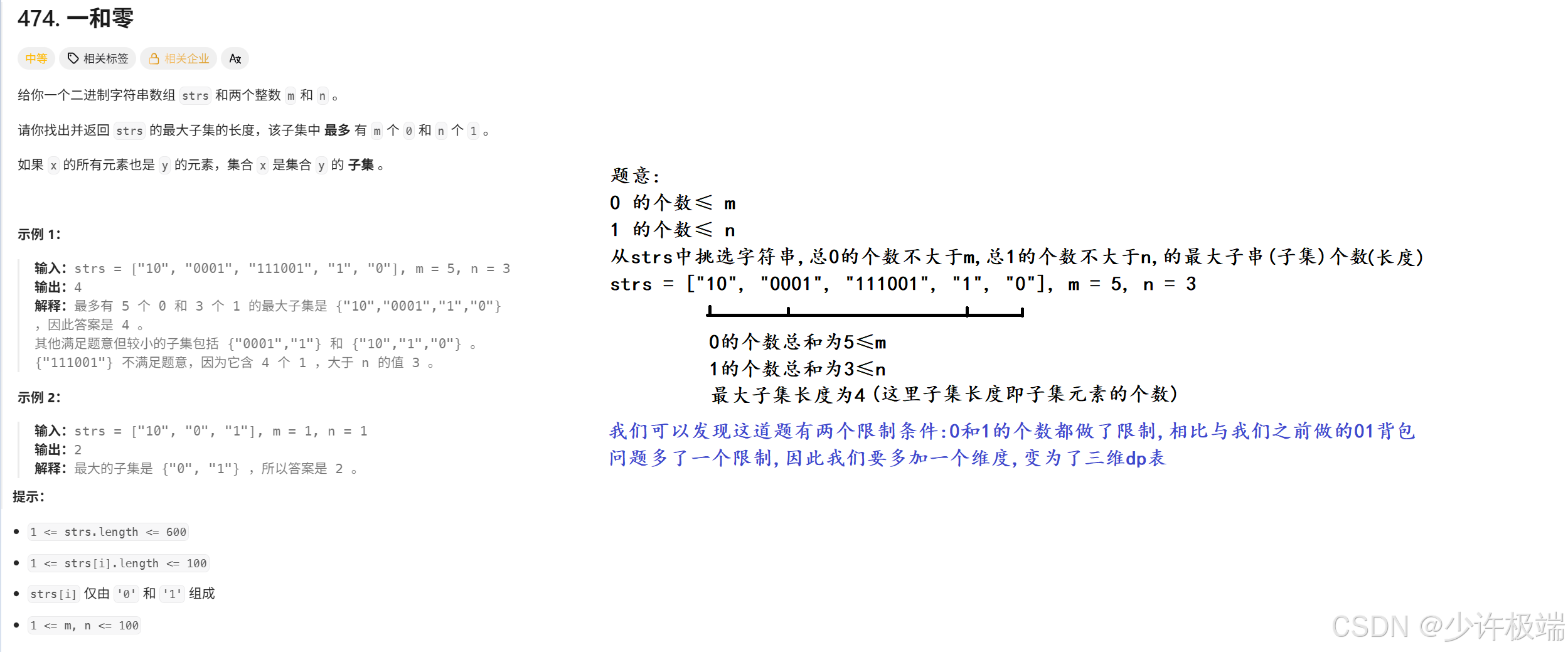 我们的第一道二维费用的背包问题模板, 这里我们会在题目解析来梳理什么是二维费用