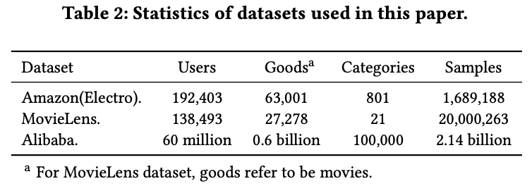 表2展示了上述数据集的统计信息。阿里巴巴数据集的规模远超亚马逊和MovieLens,这为模型性能带来更大挑战。