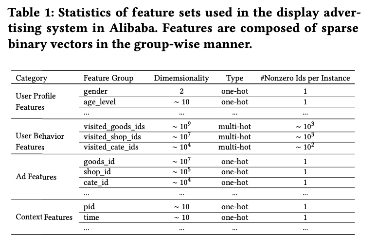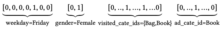 工业界CTR(点击率)预测任务中的数据通常以多组分类形式存在,例如:[weekday=Friday, gender=Female, visited_cate_ids={Bag,Book}, ad_cate_id=Book]。这类数据通常通过编码方式(如[4, 19, 21])转换为高维稀疏二值特征。