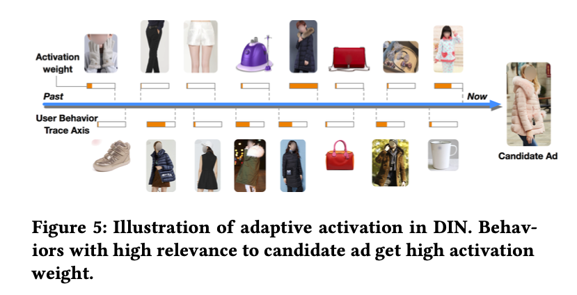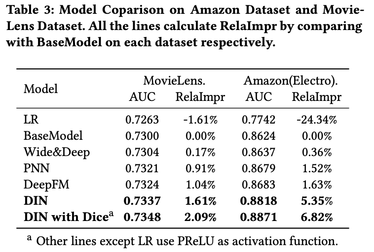 此外,采用Dice激活函数的DIN模型进一步超越了原始DIN,验证了所提出的数据自适应激活函数Dice的有效性。