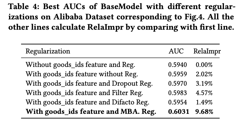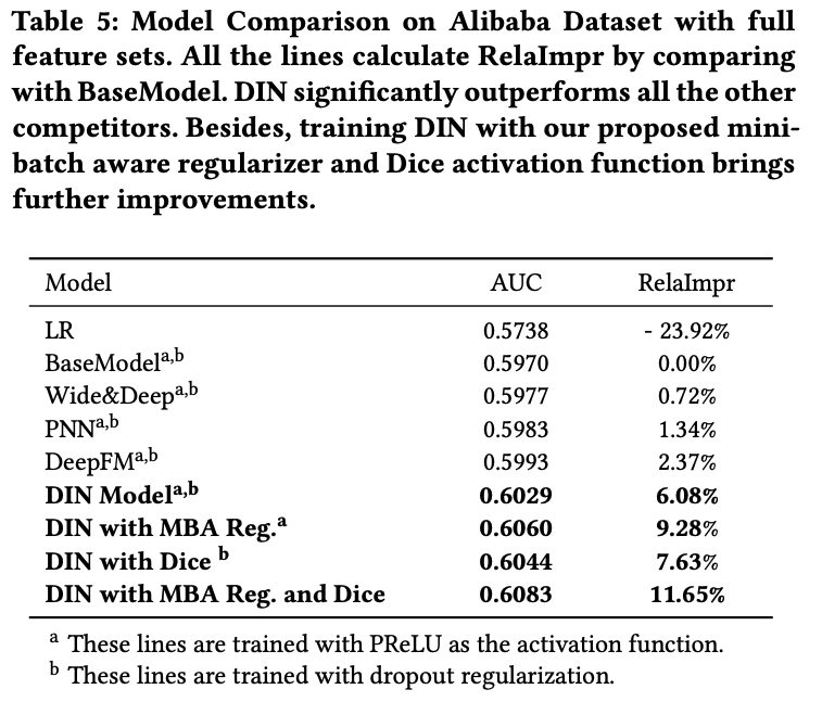 基于DIN的消融实验证明了所提出的训练技术的效果:采用小批量感知正则化(MBA)的DIN比仅使用Dropout的版本额外提升0.0031绝对AUC;使用Dice激活函数的DIN比PReLU版本额外提升0.0015绝对AUC。