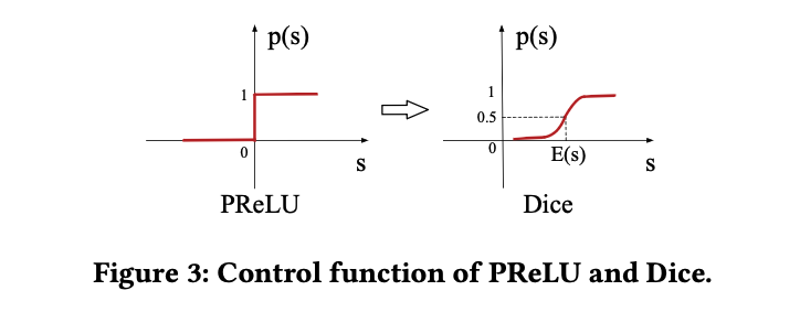 其中,s 是激活函数 f(·) 输入的一个维度,p(s) = I(s > 0) 是指示函数,用于控制 f(s) 在两种通道之间切换:f(s) = s 和 f(s) = αs。第二通道中的 α 是一个可学习参数。此处将 p(s) 称为控制函数。图3左侧展示了PReLU的控制函数。PReLU采用值为0的硬修正点,当每一层的输入遵循不同分布时可能不够理想。基于此,设计了一种新型数据自适应激活函数,命名为Dice。