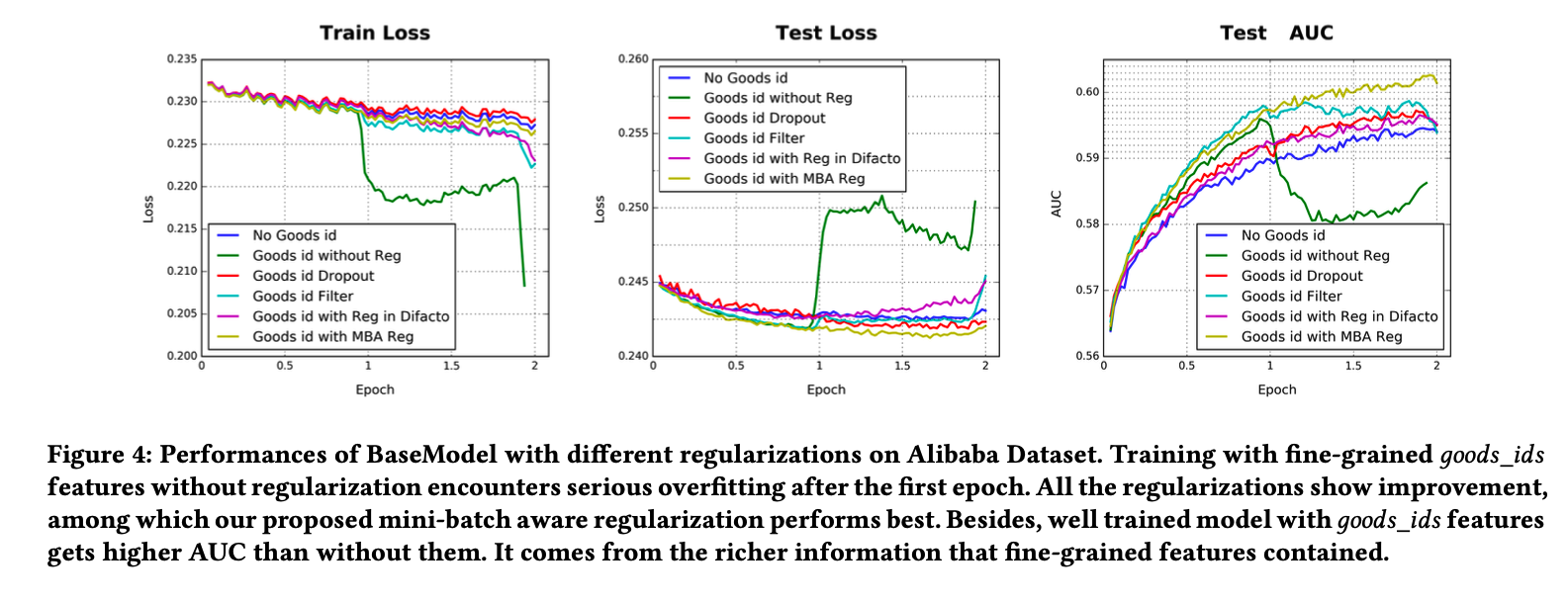 在亚马逊数据集和MovieLens数据集中,特征维度较低(约10万维),包括DIN在内的深度学习模型未出现严重过拟合问题。然而,在阿里巴巴在线广告系统的高维稀疏特征场景下(例如表1中维度达6亿的goods_id细粒度特征),过拟合成为显著挑战。若无正则化,模型在第一轮训练后即出现严重过拟合(图4深绿色曲线),导致性能急剧下降。
