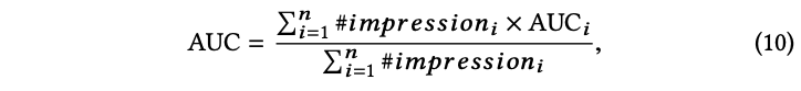 在点击率(CTR)预测领域,AUC(曲线下面积)是一种广泛使用的指标[8]。它通过按预测CTR对所有广告进行排序来衡量顺序的优劣,包括用户内部和用户间的排序。文献[7, 13]提出了一种用户加权AUC的变体,通过对用户取平均AUC来衡量用户内部排序的优劣,并证明其在展示广告系统中与在线性能更具相关性。实验中也采用了这一指标,为简化表述仍称为AUC。其计算方式如下:
