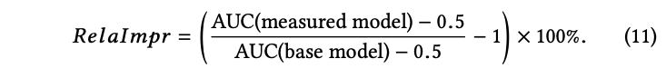 分别表示第 i 位用户的展示次数及对应的 AUC 值。此外,参照文献 [25] 引入 RelaImpr 指标来衡量模型间的相对改进效果。对于随机猜测模型,AUC 值为 0.5。因此 RelaImpr 定义如下:
