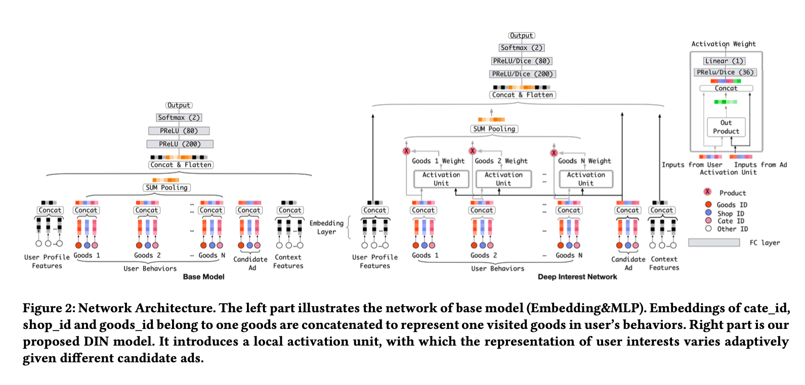本文提出深度兴趣网络(Deep Interest Network, DIN) ,通过设计局部激活单元自适应地学习用户历史行为与特定广告相关的兴趣表征。该表征向量随广告动态变化,显著提升了模型表达能力。此外,开发了两种技术: