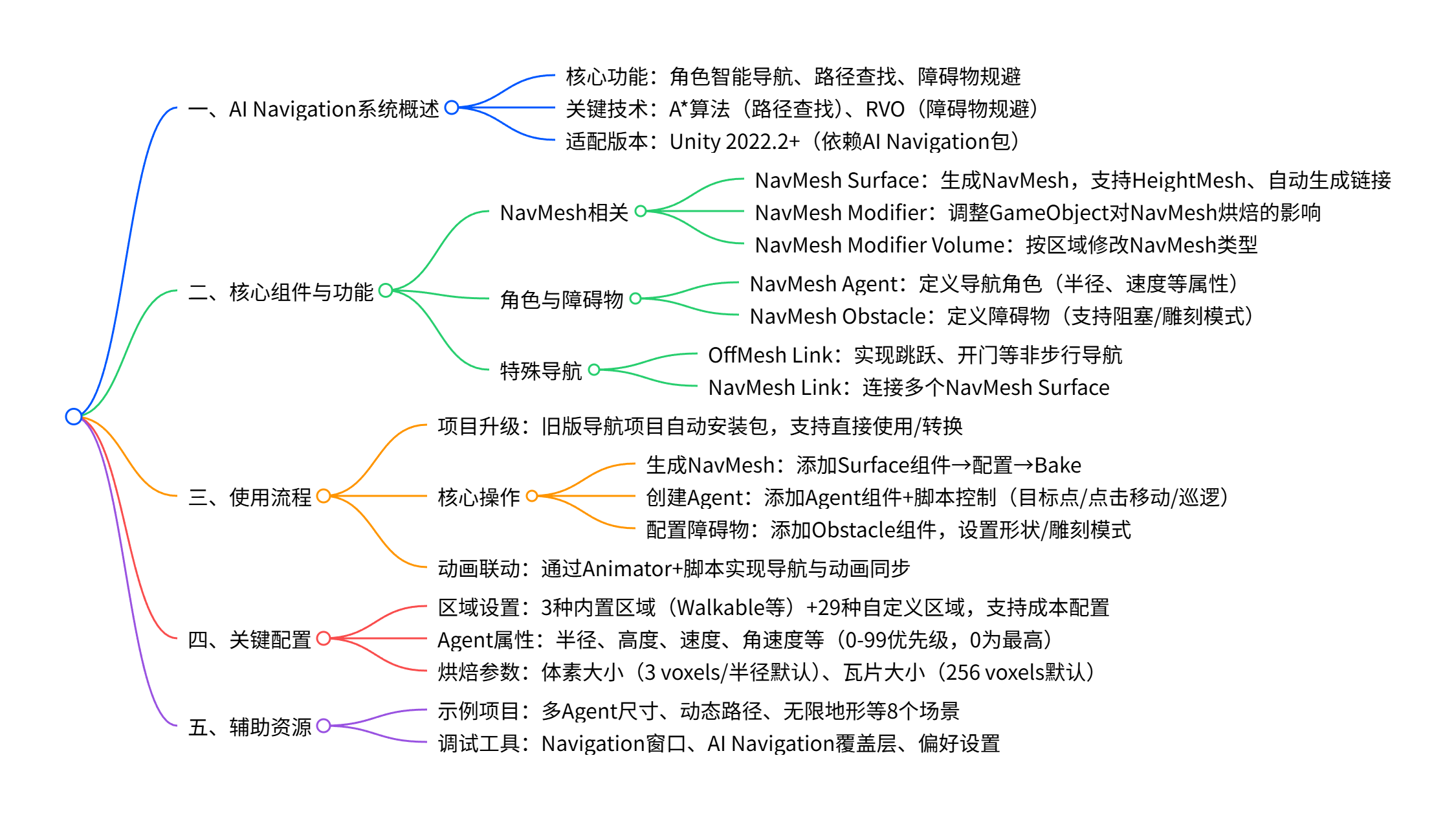 Unity 的AI Navigation 系统 (2022.2 及以上版本通过 AI Navigation 包实现)可让角色在游戏世界智能导航,核心基于自动生成的导航网格(NavMesh) ,支持动态障碍物 实时调整导航、OffMesh Link 实现跳跃 / 开门等特殊动作,关键组件包括 NavMesh Agent(角色导航)、NavMesh Surface(NavMesh 生成)等,通过A * 算法 实现路径查找,结合RVO进行障碍物规避,还可通过区域成本、Area Mask 等配置优化导航逻辑,同时提供了从旧版导航系统升级、组件配置、脚本开发(如点击移动、巡逻)等完整使用指南。