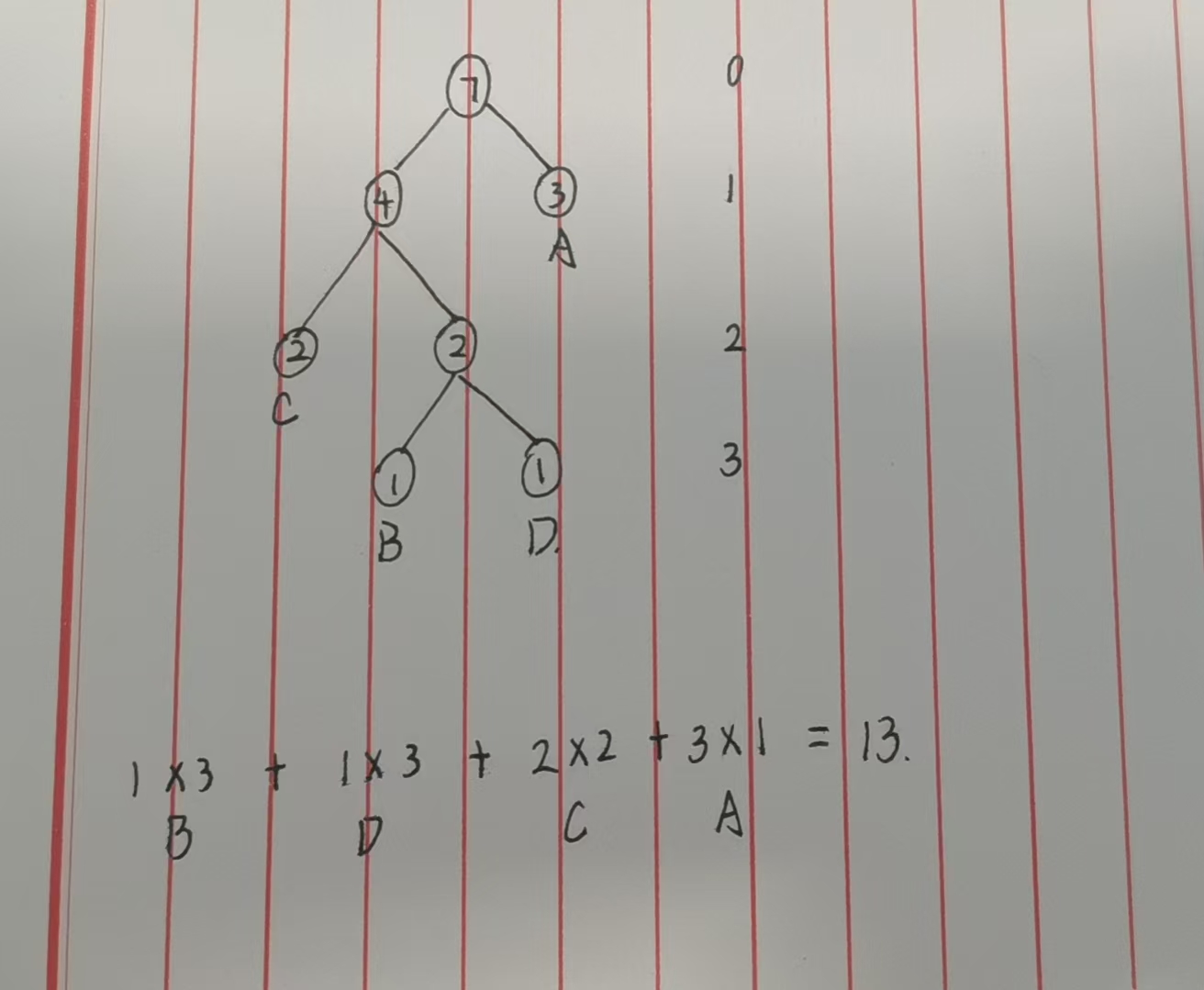 - 带权路径长度(WPL) :所有叶子节点的权重 × 该节点到根节点的路径长度 之和,公式为: