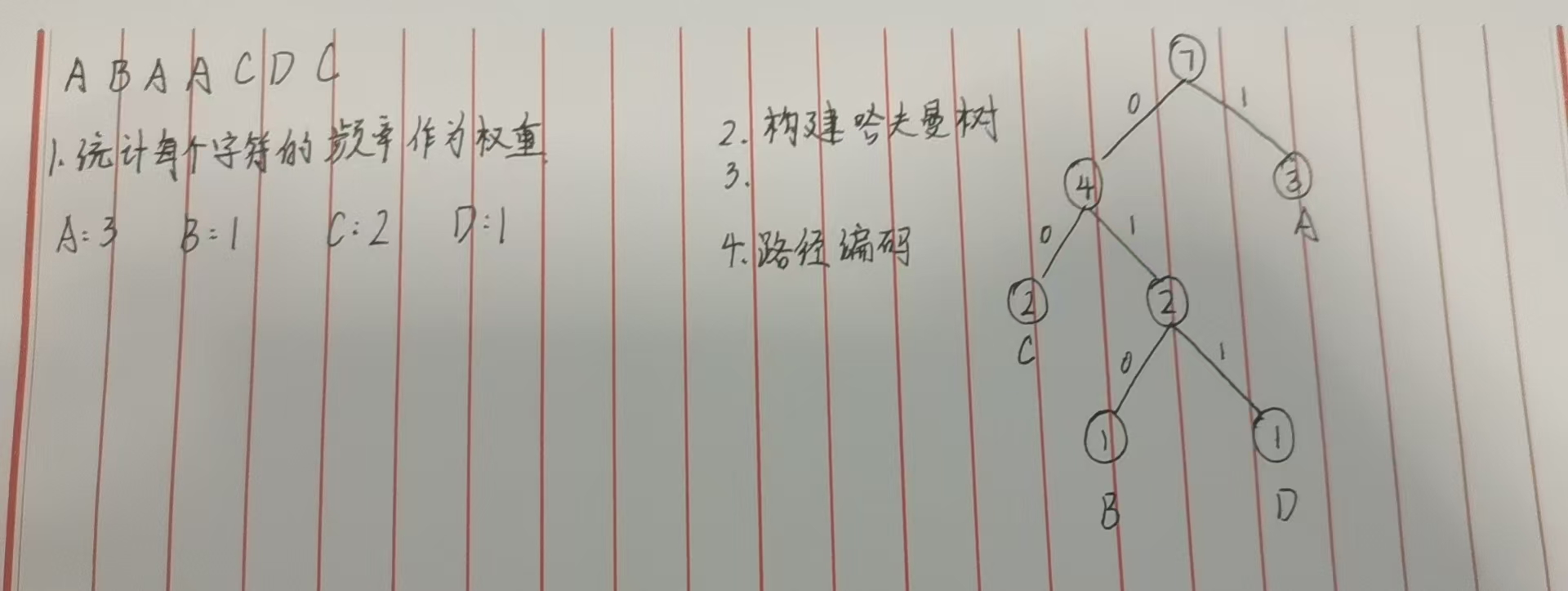 - 哈夫曼树:带权路径长度最短的二叉树,所有字符对应叶子节点,节点权重为字符出现次数。