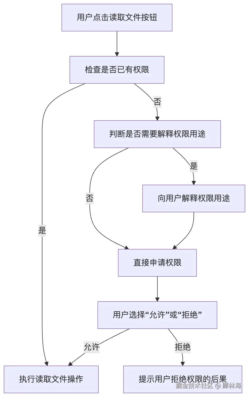 下面以"读取外部存储文件"为例,演示运行时权限的申请流程: