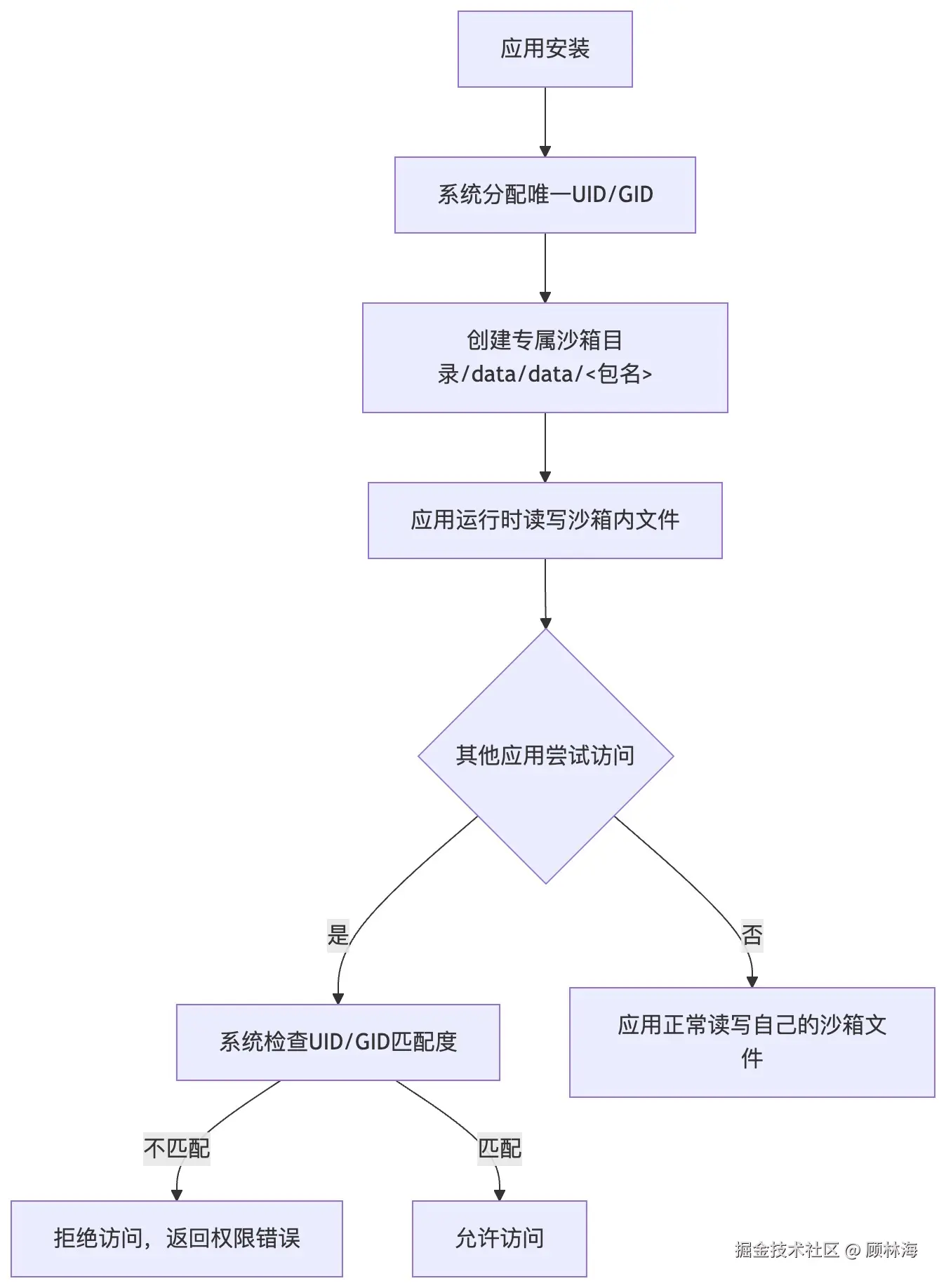 从流程图可以看出,沙箱的核心是"UID/GID匹配检查"。只要UID不匹配,其他应用就无法突破沙箱的隔离限制。这就像你家的门,只有用你家的钥匙(对应UID)才能打开,别人的钥匙(其他应用的UID)根本没用。