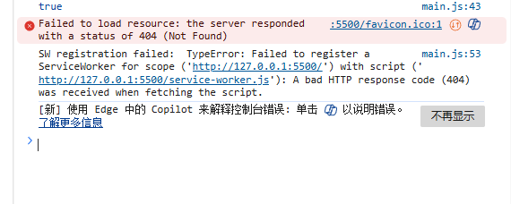 因为我们打开的访问路径是ttp://127.0.0.1:5500/dist/index.html。此时页面会去请求 service-worker.js 文件,请求路径是:http://127.0.0.1:5500/service-worker.js,这样找不到会 404。