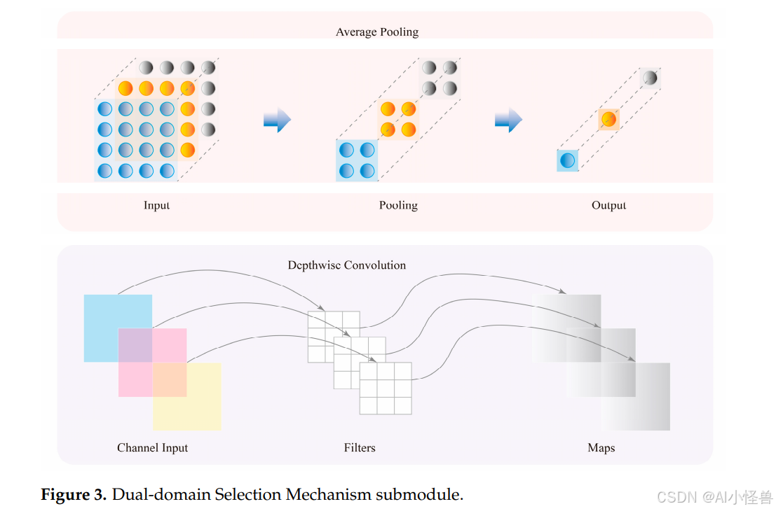最后,将所有特征输入到DSM(双域选择机制)中。该注意力机制旨在从多尺度边缘信息中高效地选择与目标任务高度相关的关键特征。通过聚焦于图像中更重要的区域,例如复杂的边缘和高频信号,该机制能从多尺度特征中自适应地选择具有更高任务相关性的特征,显著提高了特征选择的准确性和模型的整体性能。图3展示了DSM中每个子模块的详细结构。
