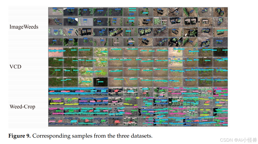 为了广泛探索MIE-YOLO的鲁棒性,在ImageWeeds[41]、VCD[42]和Weed-Crop[43]等公共数据集上进行了模型泛化实验。ImageWeeds数据集包含3975张图像,展示了美国北达科他州常见的五种不同杂草。类别包括豚草、水麻、小蓬草、红根苋和地肤。VCD数据集包含2801张图像,描绘了美国北达科他州各种作物的土壤状况、杂草侵扰和生长阶段。类别包括豆类、豆杆、玉米、玉米杆、韭菜和韭菜杆。Weed-Crop数据集包含1120张图像,展示了美国北达科他州的五种杂草和八种作物。类别包括黑豆、油菜、玉米、豌豆、亚麻、小蓬草、地肤、扁豆、豚草、红根苋、大豆、甜菜和水麻。三个数据集的对应样本图像如图9所示。