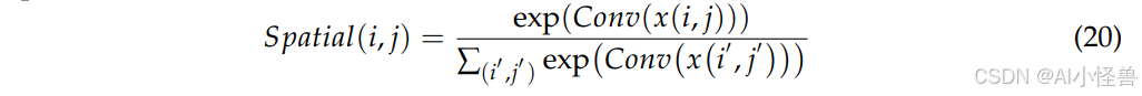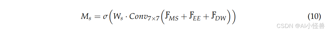 其中,Ms 代表空间注意力权重矩阵,用于指示不同空间位置的重要性。W_s 是用于空间加权的可学习参数矩阵,用于调整不同空间区域的贡献。大核卷积用于在大范围内提取空间特征,增强了目标的完整性和形状感知能力。