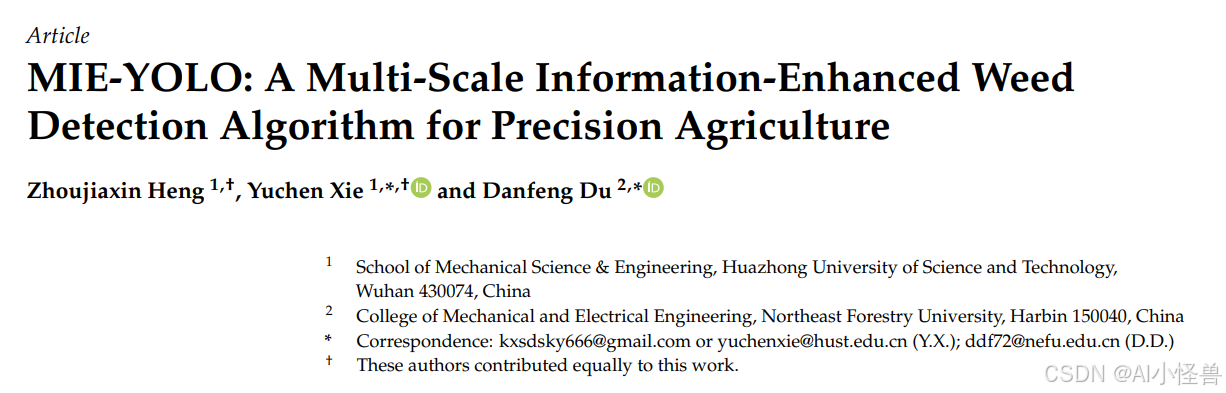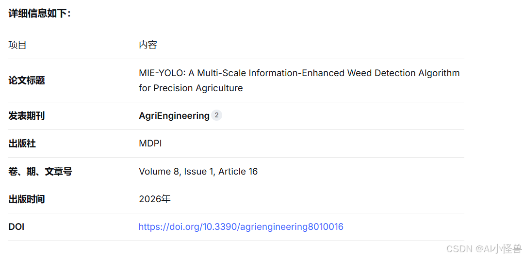 摘要 :随着精准农业对田间杂草实时检测与识别精度提出更高要求,本文提出了一种用于精准农业的多尺度信息增强杂草检测算法MIE-YOLO (Multi-scale Information Enhanced)。该算法基于当前流行的YOLO12(You Only Look Once 12)模型,结合边缘感知多尺度融合、加性门控块及双重自蒸馏技术,在保持轻量化的同时,提升了小目标及边界检测性能。首先,设计了MS-EIS(Multi-Scale-Edge Information Select,多尺度边缘信息选择)架构,有效聚合并选择不同尺度的边缘与纹理信息,以增强细粒度特征表示。其次,提出了Add-CGLU(Additive-Convolutional Gated Linear Unit,加性卷积门控线性单元)金字塔网络,通过加性融合与门控机制,增强多尺度特征的表征能力与信息传递效率。最后,引入了DEC(Detail-Enhanced Convolution,细节增强卷积)检测头,以增强细节感知能力,优化小目标与模糊边界的定位精度。为进一步提升模型检测精度与泛化性能,定义了DS(Double Self-Knowledge Distillation,双重自知识蒸馏)策略,在整个网络内部执行双重自知识蒸馏。在包含8类杂草、共计9257张图像的自建杂草数据集上的实验结果表明,MIE-YOLO将F1分数提升了1.9%,平均精度均值(mAP)提升了2.0%。此外,其计算参数量减少了29.9%,浮点运算量(FLOPs)降低了6.9%,模型大小减少了17.0%,并实现了66.2 FPS的运行时速度。MIE-YOLO在保持一定推理效率的同时,显著提升了杂草检测性能,为精准农业中的田间智能巡检与杂草精准防治提供了有效的技术路径与工程实现参考。源代码已发布于GitHub。