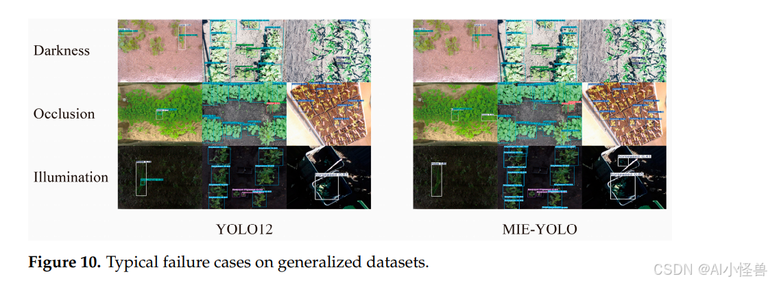 图10展示了YOLO12和MIE-YOLO在三个数据集上的典型失败案例,包括极端场景,如黑暗、遮挡和光照变化。对比图像显示,在具有挑战性的条件下,MIE-YOLO产生了明显更高的置信度分数、更精确的定位和更完整的检测结果。例如,YOLO12以一个约0.41的低置信度标记的一个小蓬草实例,被MIE-YOLO以约0.85的高置信度检测到;许多要么被YOLO12漏检、要么仅有微弱激活的小型植物,在MIE-YOLO的输出中表现为清晰的高置信度边界框。在黑暗、严重遮挡和变化光照条件下,右侧结果显示在叶片边缘和茎秆周围有更密集、对齐更好的边界框,而左侧结果则包含更多分散的低置信度边界框和一些漏检的目标。简而言之,MIE-YOLO识别了更多目标,为正确的检测分配了更高的概率,并且在背景区域上产生的虚假激活更少。