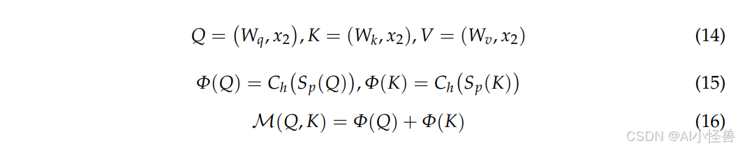 输入特征经过 LP 机制感知和提取后,被传递给 CATM 组件。首先,使用一个批归一化层和独立的线性变换将输入信息分成三部分:Q、K 和 V,分别对应于查询(query)、键(key)和值(value)矩阵。此过程使用上述输入特征 x₂ 来演示: