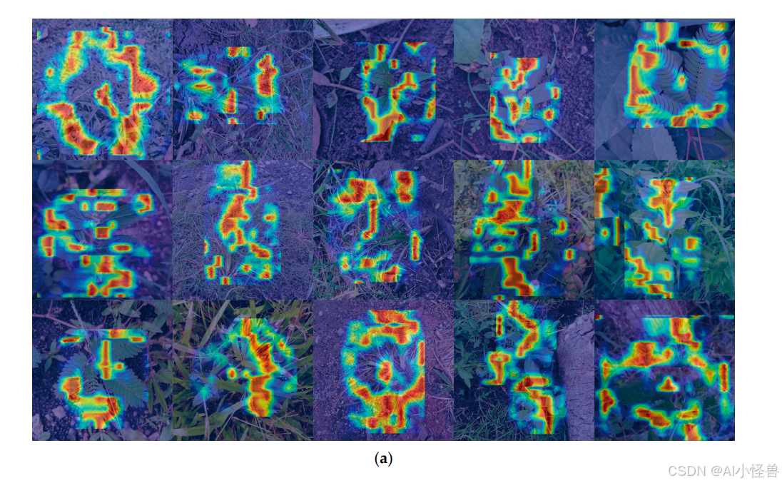 在特征热图的可视化中,MIE-YOLO在多个杂草样本上显示出连续的高响应区域。这些高响应区域通常与叶缘、茎节或植物的典型纹理特征对齐,而不是背景杂草或土壤纹理,这表明尽管存在复杂的遮挡和背景干扰,模型仍能实现更准确的空间注意力。与传统的检测器相比,热图中的高响应块更加集中,边界更清晰,背景虚假激活显著减少。这反映了MIE-YOLO在类别判断和局部特征增强方面的鲁棒性,有助于提高对纹理相近杂草的检出率。