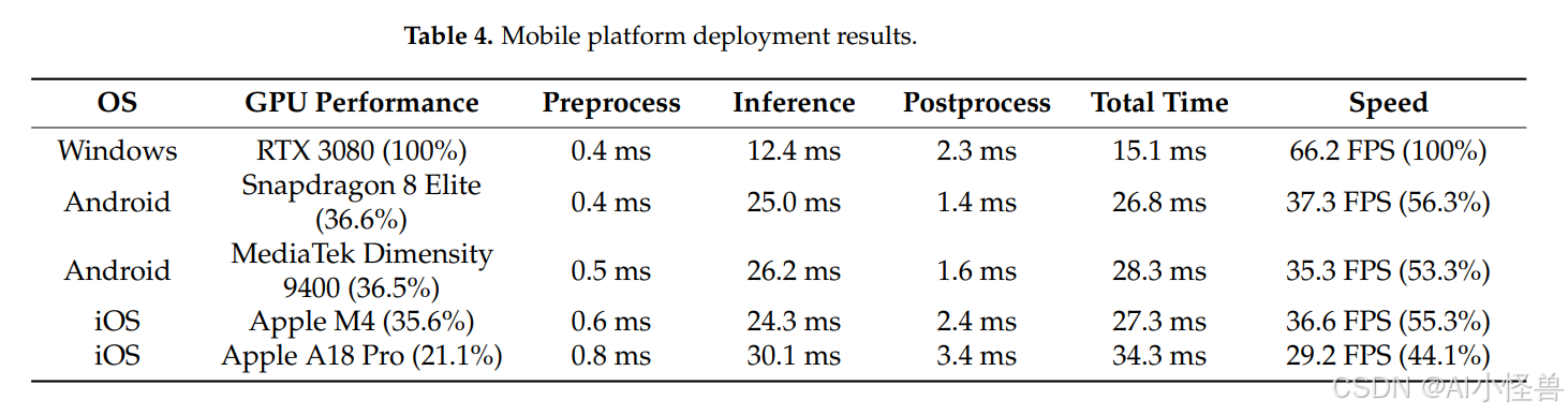 表4显示,MIE-YOLO相对于报道的GPU性能,在移动SoC上实现了不成比例的高速度。在Snapdragon 8 Elite上,该模型的运行速度是RTX 3080速度的56.3%,而该设备GPU的性能为36.6%,差距为19.7个百分点。在Dimensity 9400上,速度为53.3%,GPU性能为36.5%,差距为16.8个百分点。在Apple M4上,速度为55.3%,GPU性能为35.6%,差距为19.7个百分点。即使在低端的A18 Pro上,速度为44.1%,GPU性能为21.1%,差距为23.0个百分点。推理时间保持在20毫秒左右的中段范围,大约产生29到37 FPS,预处理和后处理开销很小,因此大部分运行时间是高效的神经推理。这些运行时优势得益于参数量减少29.9%、浮点运算量减少6.9%和模型大小减少17.0%,这降低了内存占用和计算需求。报道的GPU利用率适中,为多任务处理和节省电池留出了余量,这对于电池供电的喷雾器和无人机等田间部署非常重要。这些事实共同表明,MIE-YOLO实现了比原始设备性能预测更高的实时吞吐量,因此非常适合资源受限的嵌入式和移动平台,同时仍可通过供应商加速、量化或定向剪枝获得进一步的增益。