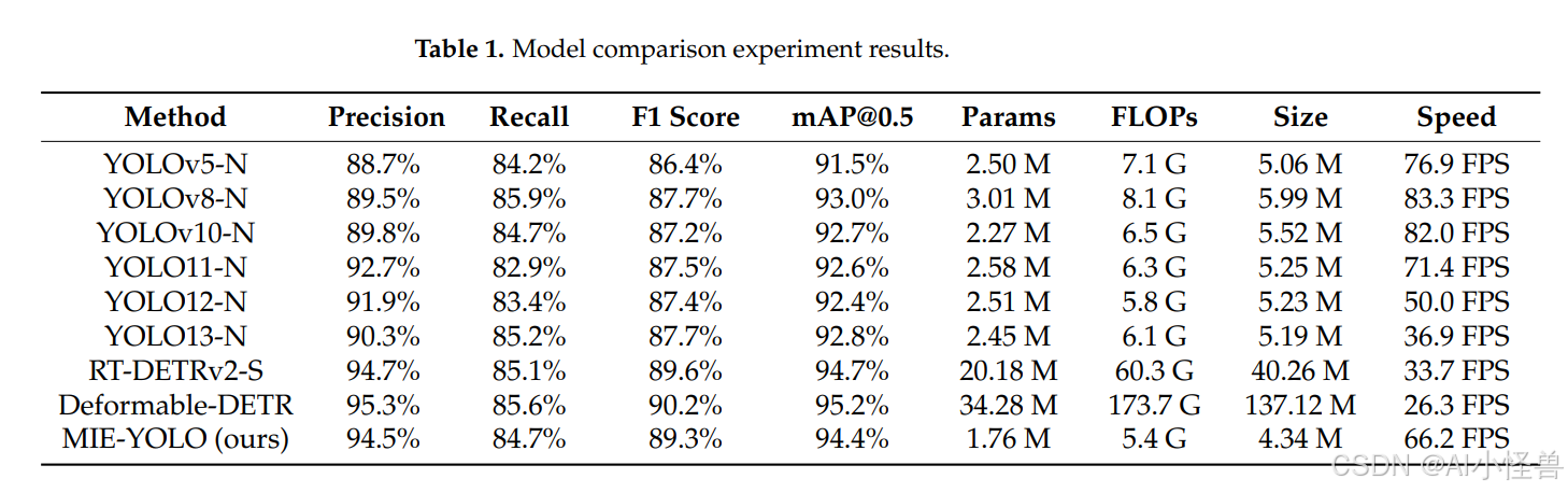 为了全面评估MIE-YOLO的性能,将其与其他经典目标检测算法进行了比较。所有模型均从头开始训练,未使用预训练权重,并在AMD Ryzen 9 5900HX CPU和NVIDIA GeForce RTX 3080 GPU上进行了测试。模型对比实验的结果如表1所示,其中包括精确度、召回率、F1分数、平均精度均值、参数量、浮点运算量、模型大小和每秒帧数等评估指标。