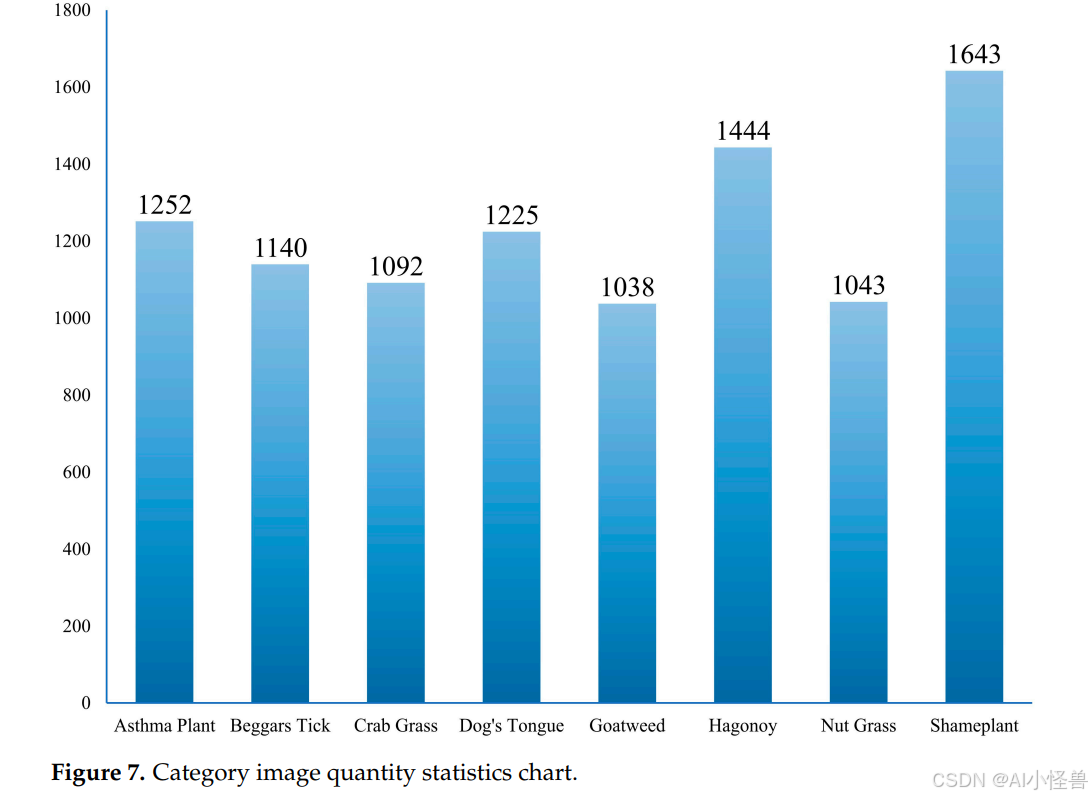 训练集和验证集按9:1的比例划分,训练集共8331张图像,验证集926张图像。杂草数据集的标注类别包括哮喘草、鬼针草、马唐、狗舌草、山羊草、哈贡草、莎草和羞羞草。各分类的具体图像数量如图7所示。