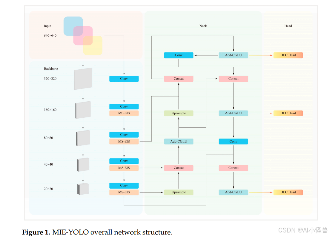 基于YOLO12-N模型,本文独立设计了MS-EIS(多尺度边缘信息选择)架构、Add-CGLU(加性卷积门控线性单元)金字塔网络和DEC(细节增强卷积)检测头。最后,结合DS(双自知识蒸馏)策略对整个结构进行知识蒸馏,从而得到所提出的MIE-YOLO。其整体网络结构如图1所示。