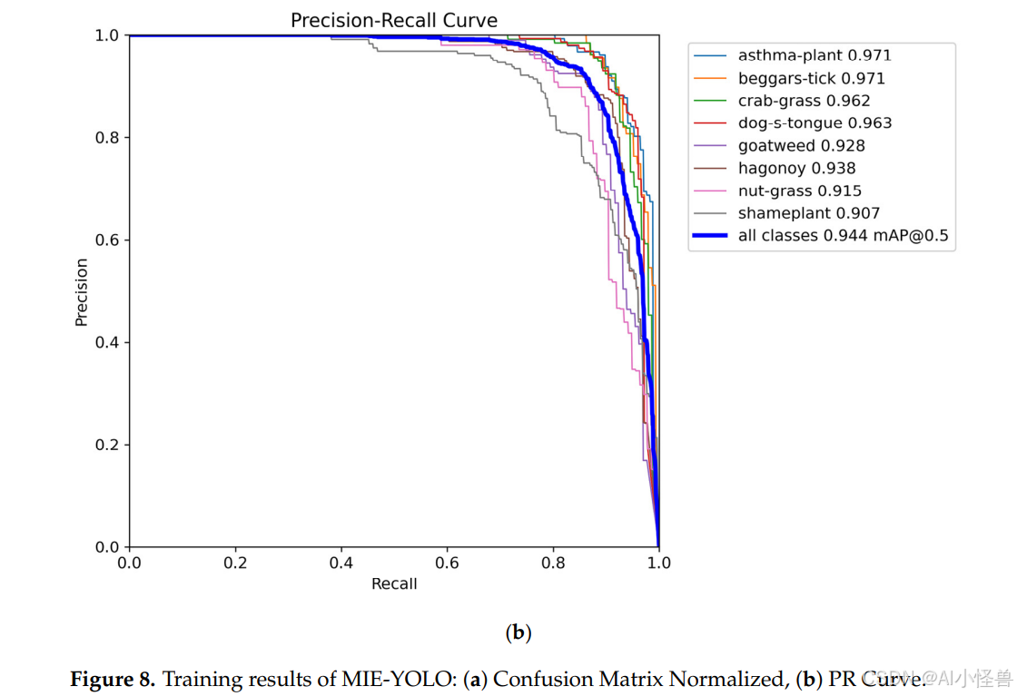 其中 P(R) 是一条显示每个检测对象的精确度随召回率变化的曲线。n是检测类别的总数,即8个,包括哮喘草、鬼针草、马唐、狗舌草、山羊草、哈贡草、莎草和羞羞草。